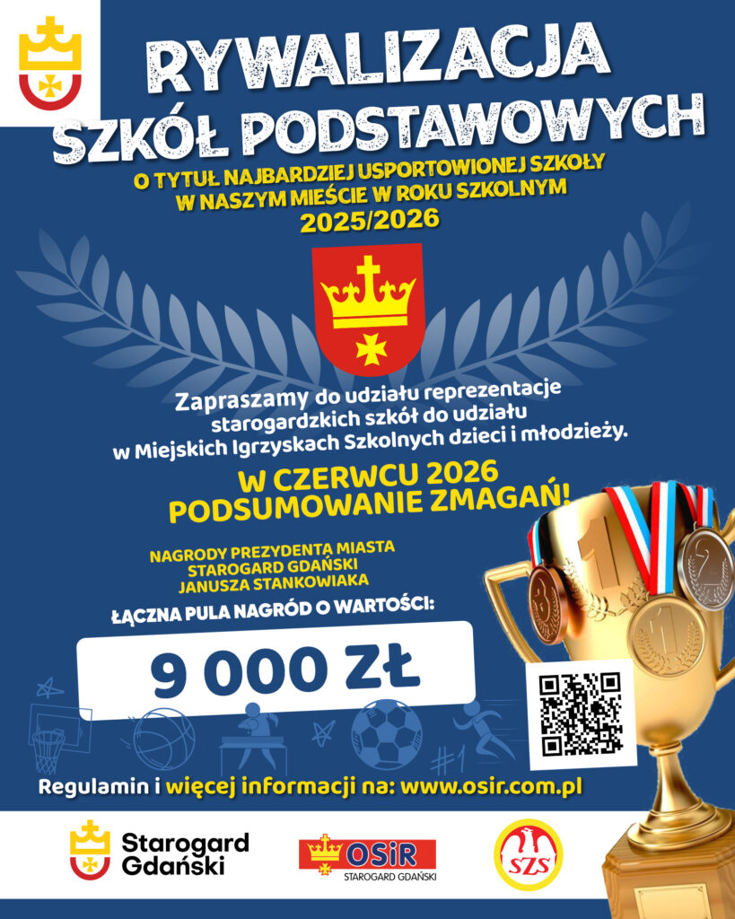 W roku szkolnym 2025/2026 szkoły podstawowe z naszego miasta rywalizują o tytuł najbardziej usportowionej placówki. Organizatorem wydarzenia jest Ośrodek Sportu i Rekreacji w Stargardzie Gdańskim, a nagrody o łącznej wartości 9000 zł przyznaje Prezydent Miasta Starogard Gdański Janusz Stankowiak. Uczniowie będą mieli okazję zmierzyć się w wielu dyscyplinach sportowych, od piłki nożnej po szachy. Celem inicjatywy jest promowanie aktywności fizycznej wśród dzieci i młodzieży oraz wyłonienie najaktywniejszej szkoły w mieście.
